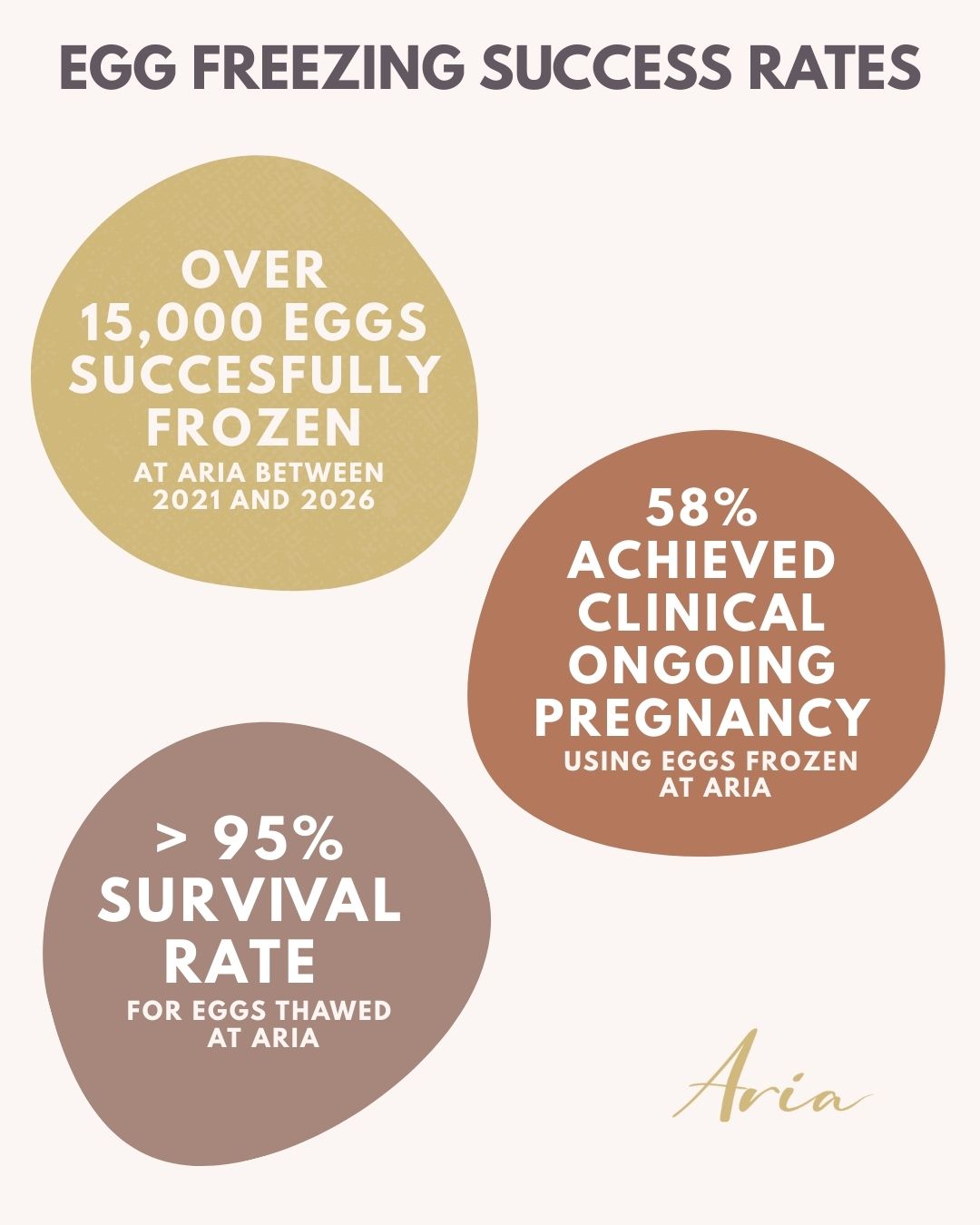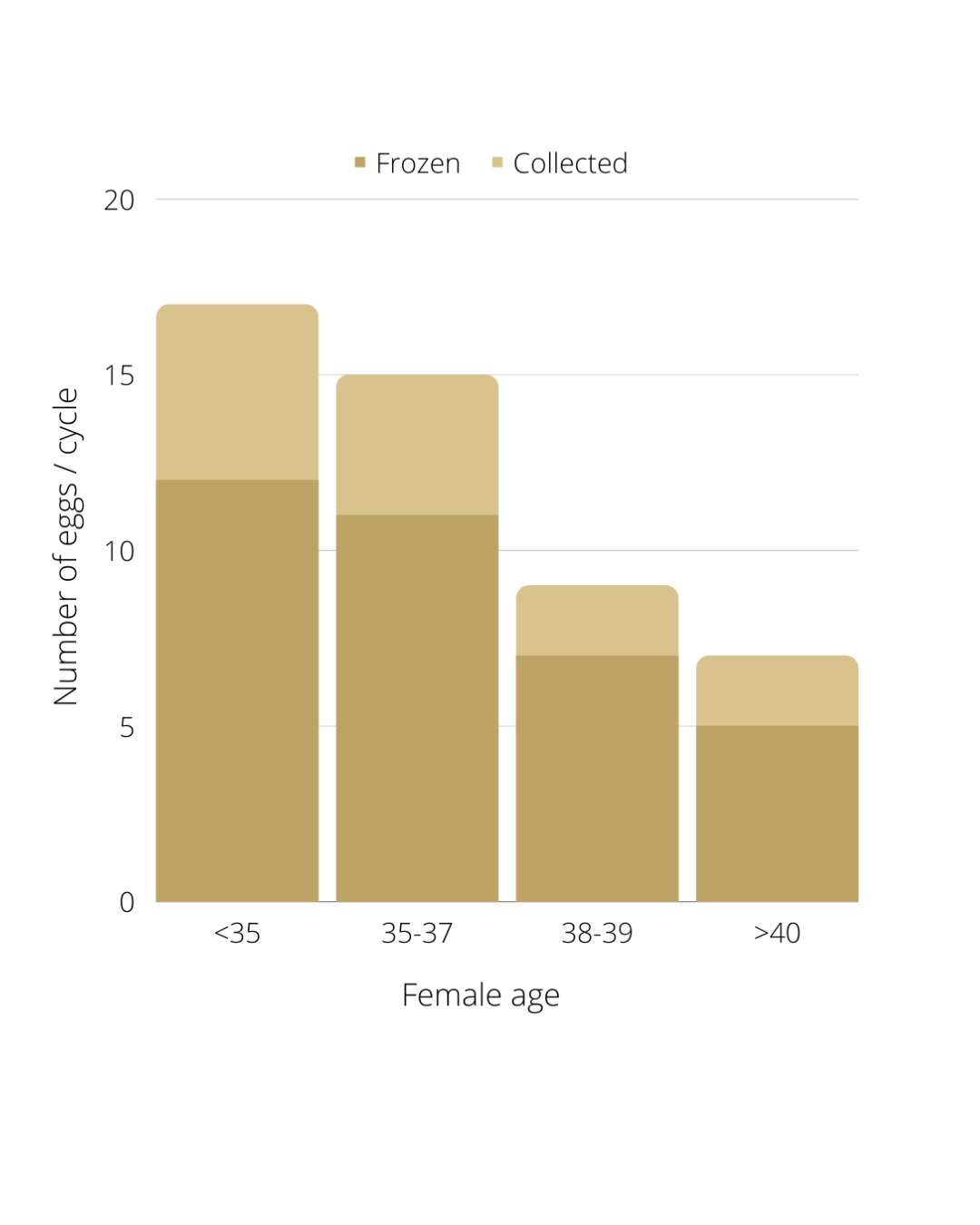 The graph shows the average number of eggs collected and then frozen from women of different age groups at Aria. Unfortunately, not every egg collected is at the correct stage of development (a mature egg) and is suitable for freezing.